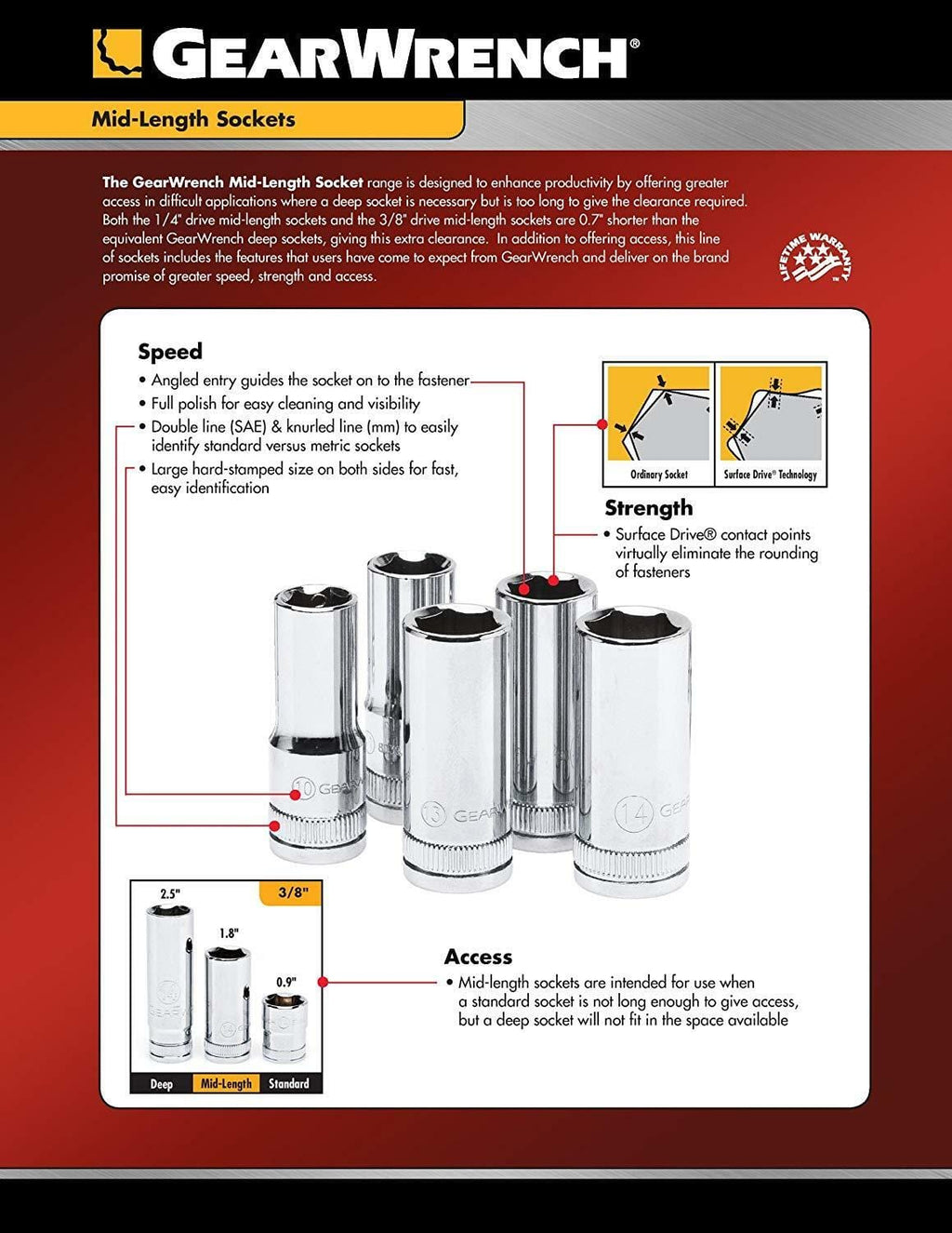• The promise of the GearWrench brand is to enhance productivity by offering tools that provide greater speed, strength and access. In our continuing quest to deliver on that promise, we're happy to announce the launch of the new line of GearWrenchmid-length in. sockets which will provide even greater access in critical applications. Of course this new line of sockets will also include all the great features and benefits professional users have come to expect from GearWrench but in a length midway between our standard and deep length sockets. Features of the entire line of GearWrench sockets includes:- Large hard stamp indicating size on both sides for easy ID- Knurled base for ease Fractional SAE/MM ID- Base of socket turned down for easy grip- Shallow broach socket walls for ability tonest in. fastener- Full polished blemish free finish for easy clean and size visibility- 6130 Alloy for added strength and durability- Surface Drive feature to grip fasteners on the flats of the bolt, both 6 & 12 ptAvailable in ¼ in. and 3/8 in. drive sizes and in both fractional and metric, the GearWrench mid-length sockets will be offered in four different sets on clip rails and in open stock. GearWrench gets it done. www.gearwrench.com Sizes:1/4 in.; Drive 6 Pt. Mid Length Metric Socket 4mm1/4 in.; Drive 6 Pt. Mid Length Metric Socket 5mm1/4 in.; Drive 6 Pt. Mid Length Metric Socket 5.5mm1/4 in.; Drive 6 Pt. Mid Length Metric Socket 6mm1/4 in.; Drive 6 Pt. Mid Length Metric Socket 7mm1/4 in.; Drive 6 Pt. Mid Length Metric Socket 8mm1/4 in.; Drive 6 Pt. Mid Length Metric Socket 9mm1/4 in.; Drive 6 Pt. Mid Length Metric Socket 10mm1/4 in.; Drive 6 Pt. Mid Length Metric Socket 11mm1/4 in.; Drive 6 Pt. Mid Length Metric Socket 12mm1/4 in.; Drive 6 Pt. Mid Length Metric Socket 13mm1/4 in.; Drive 6 Pt. Mid Length Metric Socket 14mm1/4 in.; Drive 6 Pt. Mid Length Metric Socket 15mm
