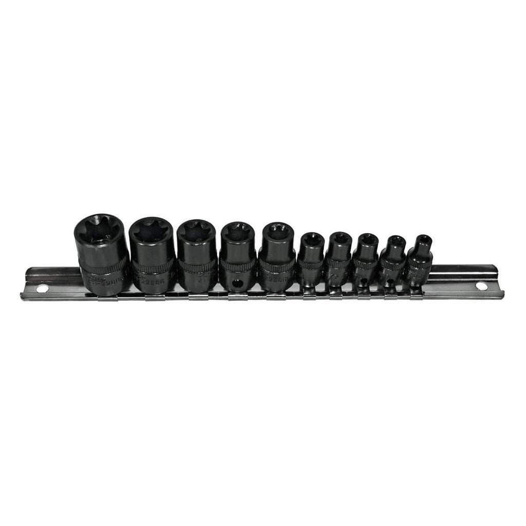 • 10-piece set is manufactured from heat-treated chrome vanadium steel for wear in professional, rugged environments. Set includes: 1/4 in. drive E-4, E-5, E-6, E-7, E-8; 3/8 in. drive E-10, E-12, E-14, E-16, E-18. Laser engraved for quick identification. Carded on socket rail.