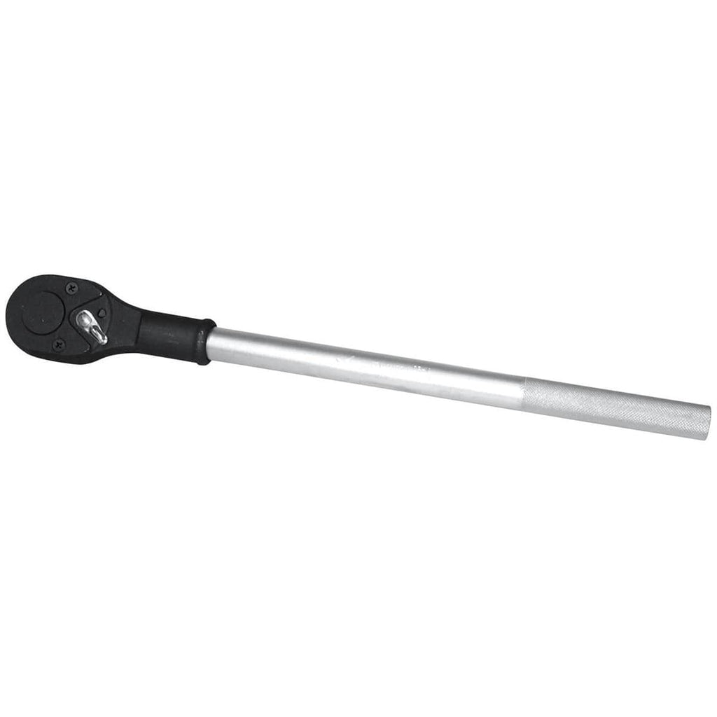 • 3/4" in. drive professional series chrome ratchet is 19-5/8" in. long. Tool features lightweight alloy handle for ease of use, high polish chrome finish, knurled handles for non-slip grip and push button release for fast socket changes. Fine tooth ratchet mechanism enables access to tight places. Thumb lever directional switch allows easy one-handed socket removal.