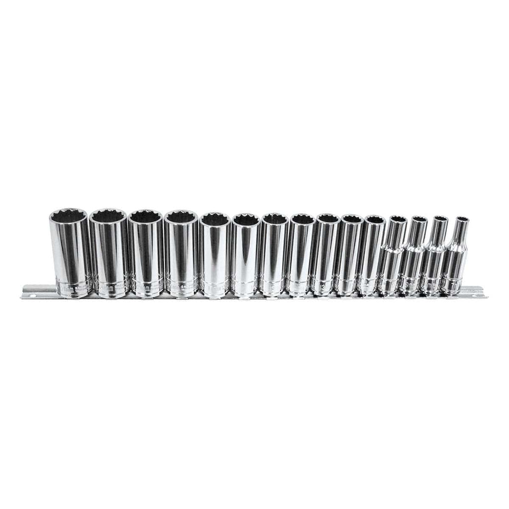 • 15-piece 3/8 in. drive metric set includes deep sockets sized from 7 mm-21 mm. All sockets are 12-point. Manufactured with heat-treated chrome vanadium. Packaged on rail organizer.