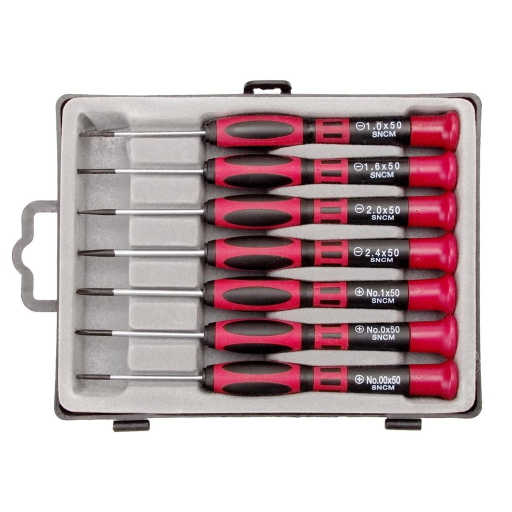 Set includes Philips sizes P00, P0, P1and Flat tip 1m, 1.6m, 2.0m, and 2.4mm wide blades.