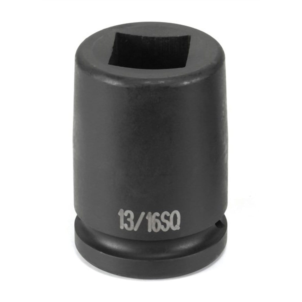 • 4-Point, Standard Length Fractional Impact Socket, 13/16" in. Square, 3/4" in. DriveGrey Pneumatic Impact Sockets are designed for professional tool users. They are engineered specifically for use with impact tools, using the most up to date industrial specifications. Grey Pneumatic Impact Sockets are made from high quality alloy steel (chrome-molybdenum). Thorough and exact heat treatment insures the correct balance of strength and durability. Grey Pneumatic Impact Sockets are tested to the highest specifications to deliver outstanding performance. Increased Strength-Transfers the pressure from the thinnest part of the socket wall toward the thicker section, resulting in increased strength.